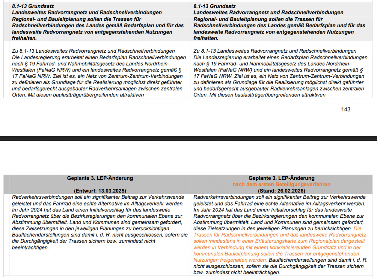 Aus Verkehrssicht besonders wichtig: Der LEP wird zukünftig einen Grundsatz 8.1-13 enthalten, dass Regional- und Bauleitplanung die Trassen für Radschnellverbindungen des Landes gemäß Bedarfsplan und für das landesweite Radvorrangnetz von entgegenstehenden Nutzungen freihalten sollen. Damit wird der Aufbau eines durchgängigen Radverkehrsnetzes in NRW auch durch die Raumordnung unterstützt. In der überarbeiteten LEP-Version wurden noch Klarstellungen eingearbeitet, wie genau das erfolgen soll. Die Entwürfe für Radvorrangnetz und Radschnellverbindungs-Bedarfsplan, die dann einzuarbeiten sein werden, sollen in diesem Jahr vorgelegt werden.