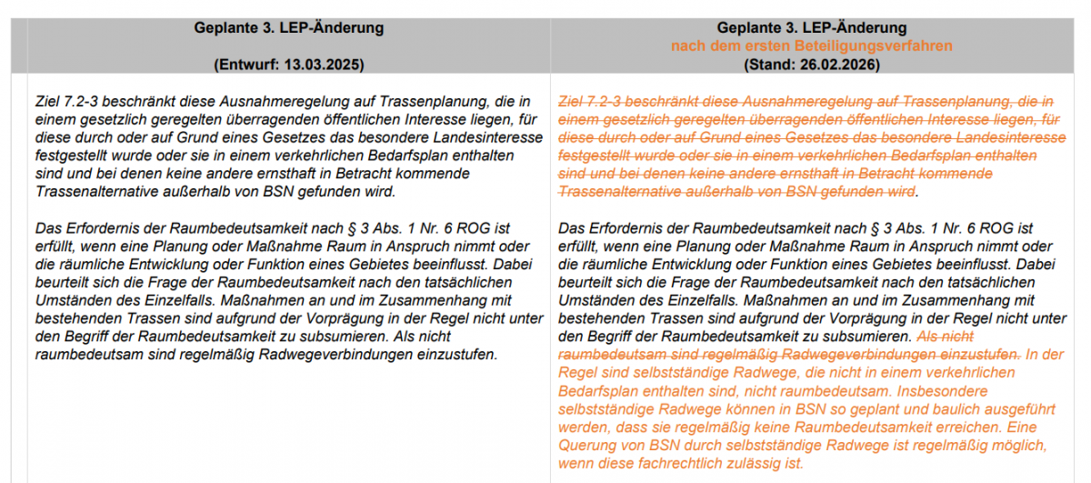 Wichtig für den Radverkehr ist zudem eine ausdrückliche Klarstellung in den Erläuterungen, dass auch innerhalb bestimmter für den Naturschutz relevanter Gebiete weiterhin die Anlage von Radwegen möglich ist.